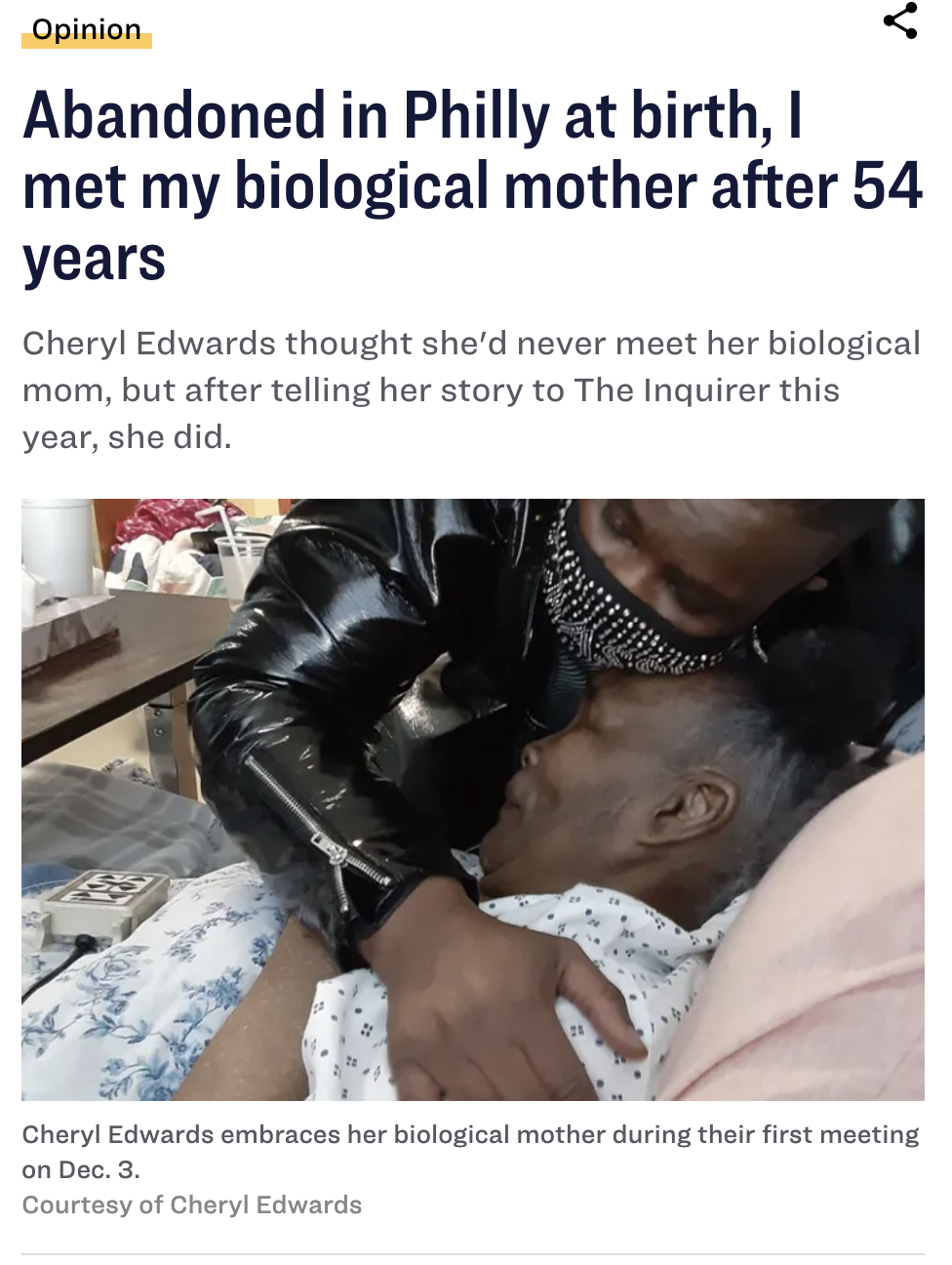 I passed her message to reporter Stephanie Farr, who profiles Philadelphians regularly. She wrote a beautiful profile of Cheryl, which was featured in The Inquirer Morning Newsletter. Cheryl hoped that in telling her story, she would be able to find her biological family. She did.