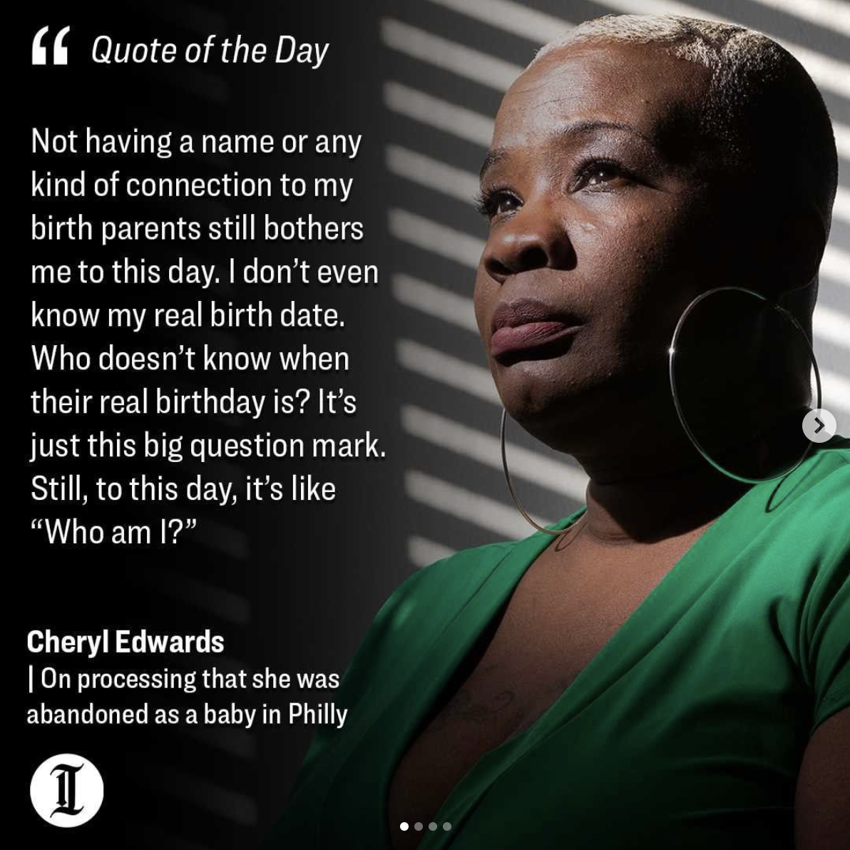In 2021, I found a DM on our Instagram account from Cheryl Edwards, a woman who was born in Philly but had been abandoned as a baby. She was ready to tell her story and reached out to us on Instagram in the hopes that someone would see her message. I did, because I consistently scan through our DMs and comments to stay on top of what our audience is talking about.