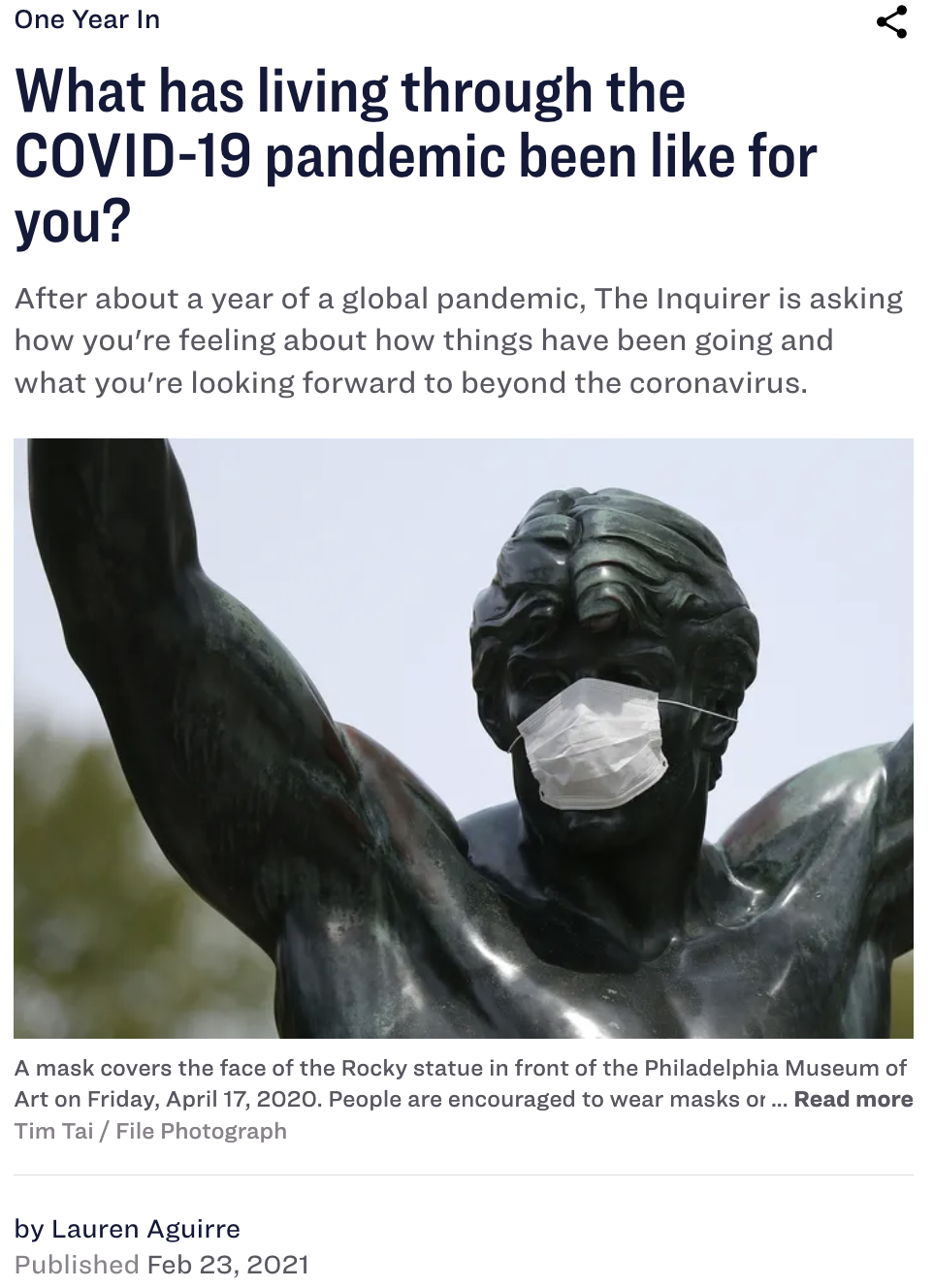 In 2021, the newsroom decided to create a collection of stories across desks that reflected on being “One Year In” to the pandemic. As a part of this collection, I pitched a callout that would allow for residents in the Philly area to share their experiences during an isolating 2020. The video team joined this project after they saw my pitch, and the resulting video used sources from the same group of callout responses.